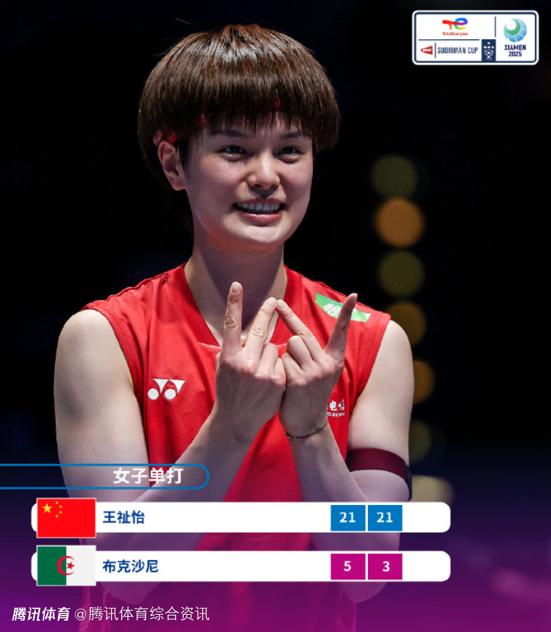 第二场女单比赛,王祉怡分别以21-5、21-3轻取阿尔及利亚的布克沙尼。