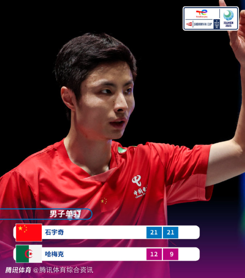第三场男单比赛,石宇奇分别以21-12、21-9力克哈梅克。