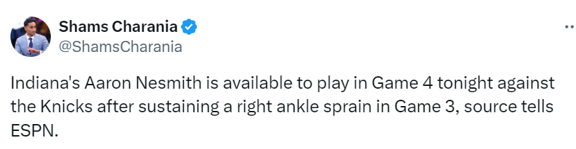 2025-05-28 05:50北京时间5月28日,根据名记Shams发布的消息显示,步行者球员内史密斯在G3遭遇右脚踝扭伤后,将可出战球队今日对阵尼克斯的东部决赛第四场比赛。